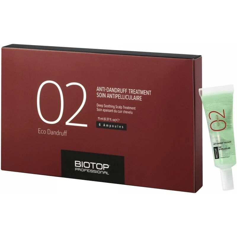 BIOTOP Professional „02 Eco Dandruff Anti-Dandruff“ yra intensyvus kompleksinis pleiskanų gydymo serumas ampulėse, kurio sudėtyje esantys natūralūs ekologiški ingredientai padeda reguliuoti riebalinių liaukų veiklą, apsaugo nuo perteklinės riebalų sekrecijos ir kovoja su padidėjusiu galvos odos riebumu.